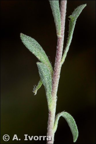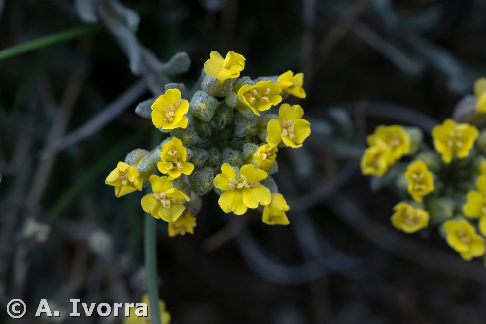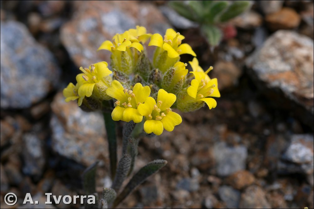 Planta anual, hasta de 15 cm. Tallos ascendentes, a veces ramificados, con pelos estrellados y bifurcados. Hojas oblongo-espatuladas o elípticas, gradualmente estrechadas en el pecíolo, pubescentes, con pelos estrellados de (4) 6 a 8 brazos en el envés. Racimosdensos. Flores actinomorfas, hermafroditas, tetrámeras. Cáliz con sépalos hirsutos, caedizos. Corola con pétalos ligeramente contraídos hacia la mitad, emarginados, amarillos. Androceo con 6 estambres,