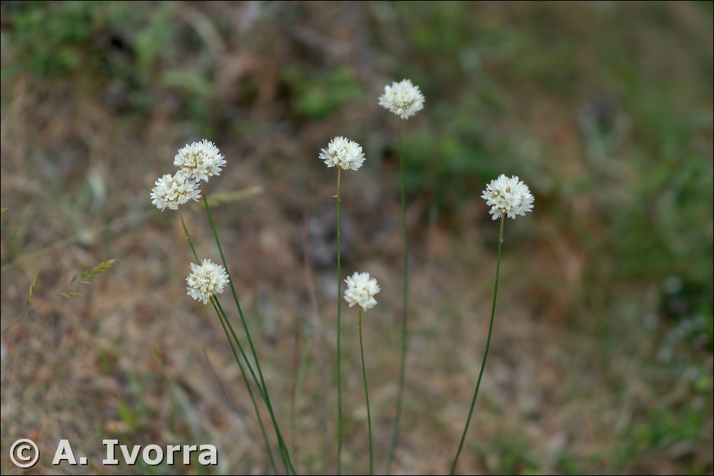 Planta herbácea, perenne, más o menos cespitosa. Escapos de 20-40 cm, erectos. Hojas de lineares a linear-lanceoladas, con 1-3 nervios; vainas poco fibrosas. Involucro de 15-20 mm de diámetro, con 14-20 brácteas pajizas y lisas (o un poco rugosas las externas), dispuestas en orden creciente de tamaño hacia el interior. Flores en cimas escorpioides muy reducidas. Cáliz de 6-8 mm, con hileras de pelos; espolón de 0,5-0,8 mm. Corola blanca, con los pétalos soldados en la base. Androceo con 5 estambres, insertos en la base de la corola. Gineceo súpero, pentacarpelar, unilocular, con 5 estilos. Fruto seco, monospermo, incluido en el cáliz.