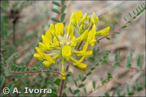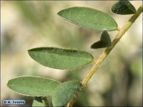 Hierba perenne, de 30-40 cm, con pelos blancos esparcidos. Hojas compuestas, imparipinnadas, con 11-13(20)