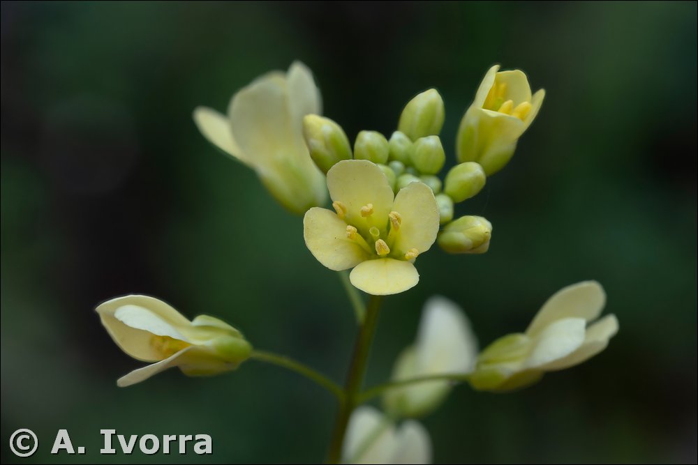 amplexicaules; todas de color verde intenso, frecuentemente con tintes violáceos, glabrescentes o con pelos cortos. Inflorescencia ebracteada, laxa; racimos alargados en la fructificación. Flores actinomorfas, hermafroditas, tetrámeras; amarillentos, glabros, apenas gibosos; pétalos auriculados en la base y con uña muy corta, amarillos; estambres 6, tetradínamos; ovario súpero. Frutos en silícula angustisepta, planos, dídimos; valvas suborbiculares o elípticas, con el margen plano y brevemente alado, glabras