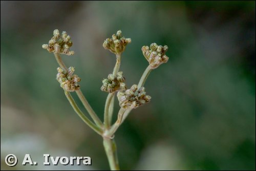 Hierba perenne, hasta de 80 cm., glabra. Tallos erectos, muy ramificados, estriados, con restos de hojas viejas en la base. Hojas basales numerosas, 2-3 pinnatisectas, largamente pecioladas, con las bases persistentes y fibrosas segmentos foliares con lóbulos obtusos las caulinares poco numerosas, semejantes pero de menor longitud o reducidas a un folíolo. Umbelas compuestas, con 3 a 8 radios, casi todos de menos de 2 cm, desiguales,