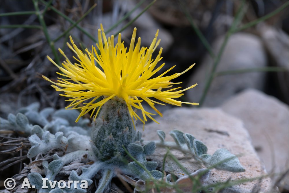 el centro de cada roseta foliar.Involucro ovoideo-cilíndrico; brácteas araneosas, las medias con apéndice apical espinoso, triangular, decurrente, pajizo o algo ferruginoso, con de 7 a 10 pares de fimbrias laterales de hasta 2 mm, y espina terminal de hasta 4 mm, poco vulnerante. Flores flosculosas, amarillas o anaranjadas,