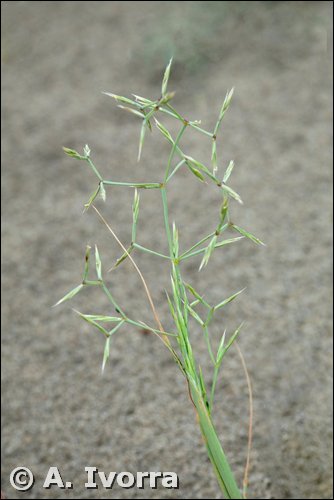 Hierba anual, cespitosa, hasta de 35 cm. Tallos erectos o ascendentes, a veces procumbentes, glabros, con 1 a 3 nudos purpúreos. Lámina de las hojas plana lígula membranácea vaina superior dilatada cubriendo parte de la inflorescencia. Panícula laxa, con ramas muy divaricadas tras la antesis. Espiguillas comprimidas lateralmente, con pedúnculos aculeolados, y 2 a 3 flores hermafroditas glumas muy agudas, acuminadas,