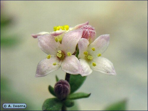 hermafroditas, actinomorfas, tetrámeras. Cáliz ausente. Corola rosada, rotácea,