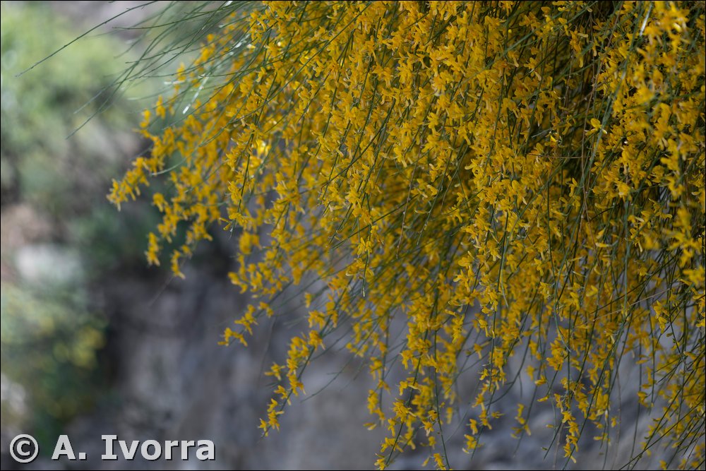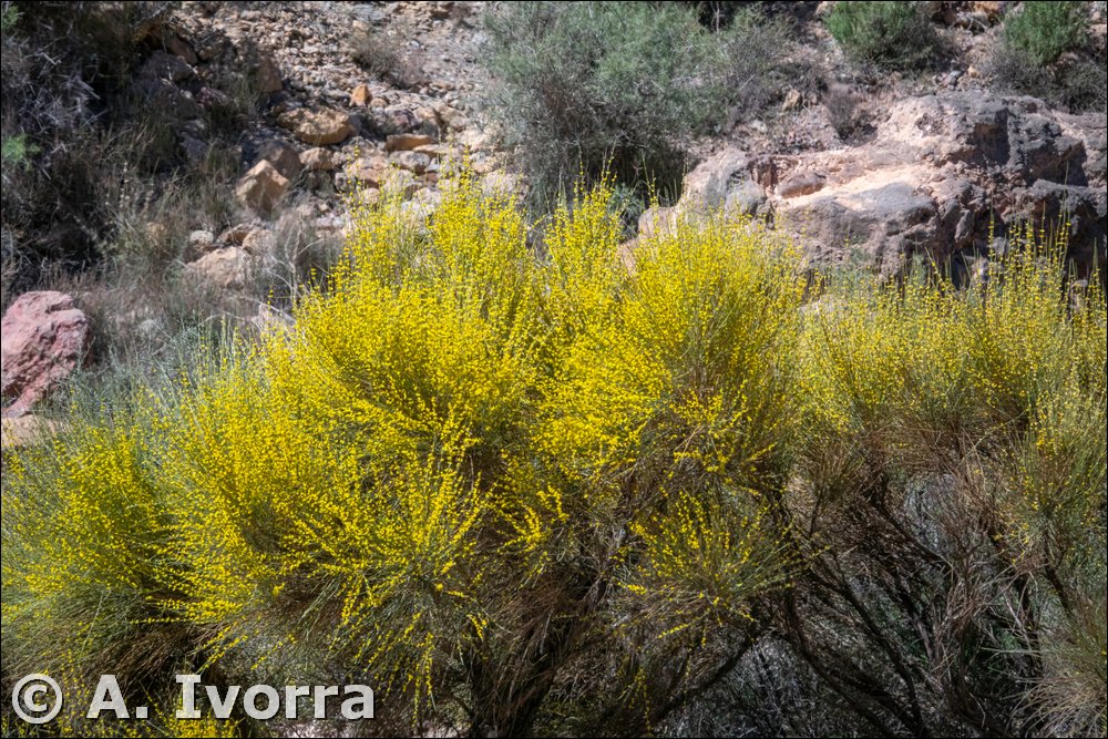 Sufrútice o arbusto, hasta de 3 m. Muy ramificado, con ramas alternas, divaricadas, inermes, retamoides, poco foliosas en la floración. Tallos con 11 a 12 costillas en forma de T. Hojas alternas, estipuladas, unifolioladas, muy fugaces órgano estipular recorrido por 3 costillas. Inflorescencias axilares cortas, con 3 a 10 flores. Flores papilionadas, amarillas, pediceladas. Cáliz campanulado-globoso, bilabiado, seríceo-plateado, con el tubo frecuentemente más largo que los labios. Corola