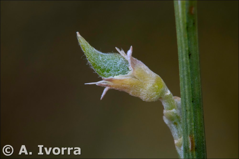 amarilla, con el estandarte más corto que la quilla estandarte glabrescente, quilla serícea. Androceo con 10 estambres. Fruto cónico, con las caras biconvexas y pico algo falcado, seríceo-viloso, con 1 semilla, rara vez dos.