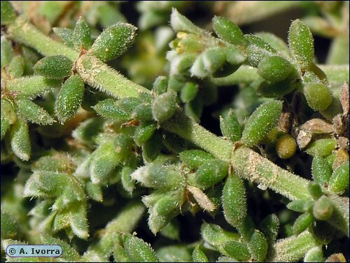 pubescente, leñosa en la base, con tallos postrados o suberectos, muy