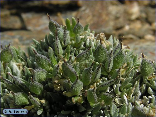 silícula, cuyas valvas presentan pelos estrellados. Semillas elípticas, de 3 x