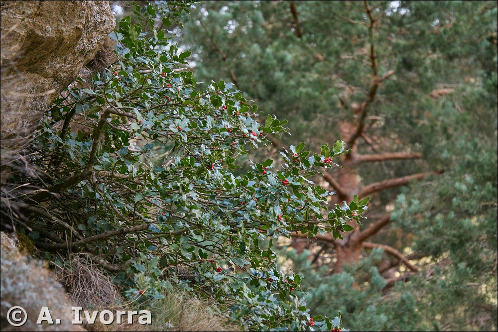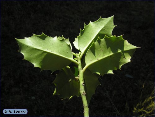 "acebo". A menudo se cultiva como ornamental. Su madera es muy