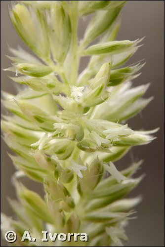 de 0,1 mm, con márgenes escábridos sin cilios. Panícula de 3 a 6 cm, habitualmente espiciforme, densa. Espiguillas con 2 o 3 flores, comprimidas lateralmente. Glumas de desiguales a subiguales gluma inferior uni- o binervada gluma superior lanceolada, de aguda a mucronada, con mucrón hasta de 0,1 mm, con quilla escábrida, glabra, trinervada. Lema de agudo a mucronado, con quilla escábrida, con dorso peloso, frecuentemente más peloso hacia el ápice.