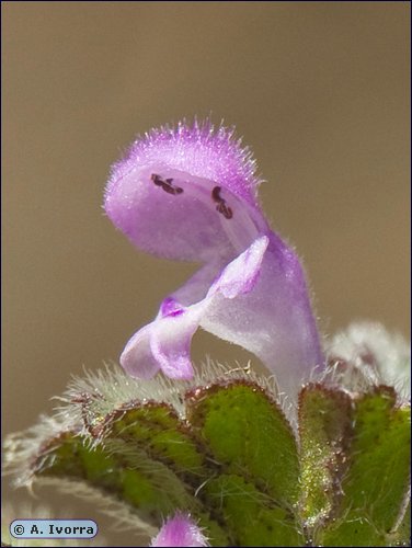 púrpura pálido; tubo recto, bruscamente ensanchado arriba; labio superior mayor