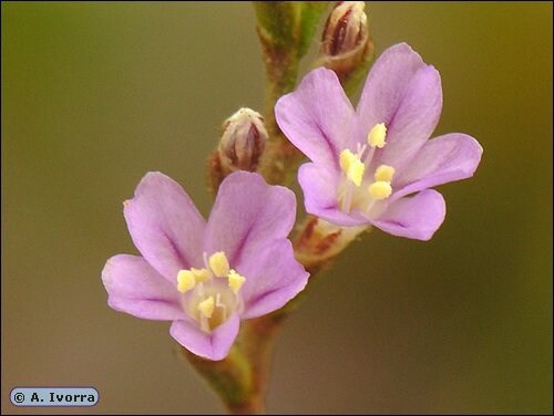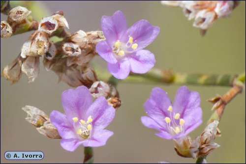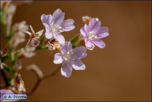 Flores hermafroditas, actinomorfas, de unos 5 mm de diámetro. Cáliz gamosépalo, con 5 costillas. Corola con 5 pétalos violáceos, de unos 7 x 2 mm, con ápice