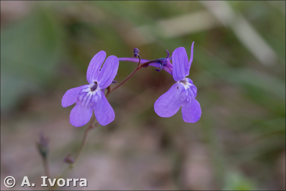 flores purpúreas). Pedicelos de 4-10 mm, mayores que las brácteas. Cáliz con 5 sépalos
