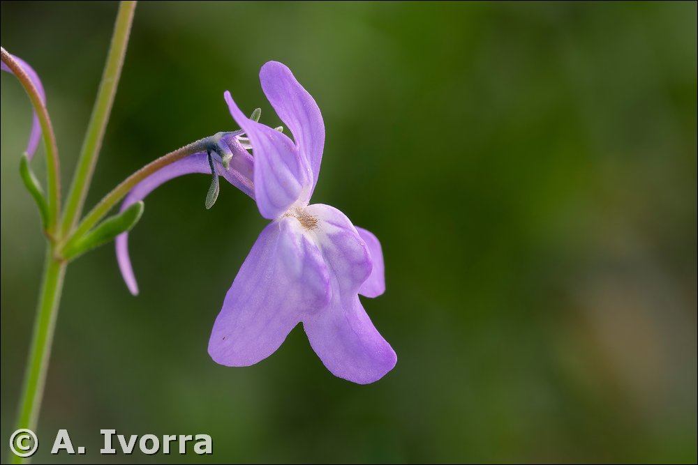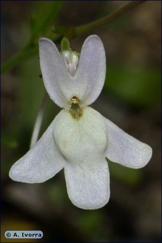 labio superior bilobado y el inferior, trilobado), personada, con espolón de 9-12 mm. Androceo con 4