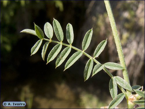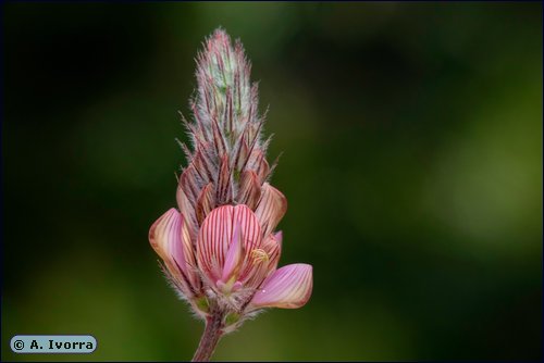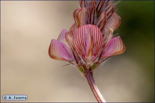 Planta hasta de 45 cm, sufruticosa, serícea. Tallos decumbentes o ascendentes, densamente seríceos. Hojas de 3 a 10 cm, imparipinnadas, pecioladas, con 6 a 12 pares de folíolos, estrechamente elípticos o estrechamente obovado-elípticos, enteros, los de las hojas basilares frecuentemente elípticos, glabros o dispersamente pelosos por el haz, densamente seríceos por el envés; estípulas membranáceas, soldadas a la base del pecíolo y entre sí. Inflorescencias espiciformes, axilares, densas, generalmente con más de 10 flores, marcadamente comosas antes de la antesis; pedúnculo de 10 a 30 cm, de 3 a 4 veces más largo que la hoja axilante. Cáliz con dientes de 2 a 4 veces más largos que el tubo, con indumento denso de pelos patentes. Corola casi 1,5 veces más larga que el cáliz, papilionada, rosada con nervios purpúreos; estandarte tan largo o algo más corto que la quilla, raramente algo más largo; alas bastante más cortas que el cáliz; quilla curvada en ángulo recto. Androceo diadelfo. Fruto aqueniforme, indehiscente, comprimido lateralmente, de contorno semiorbicular o semiobovado, con espinas en las caras de 0,2 a 0,8 mm, frecuentemente reducidas a pequeños tubérculos, y margen dorsal con 5 a 7 espinas de 0,4 a 1,5 mm, más o menos densamente peloso, con pelos de menos de 1 mm.