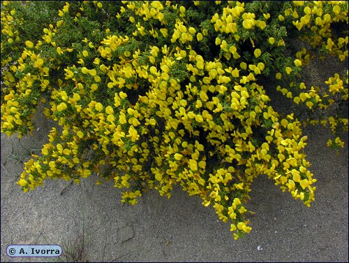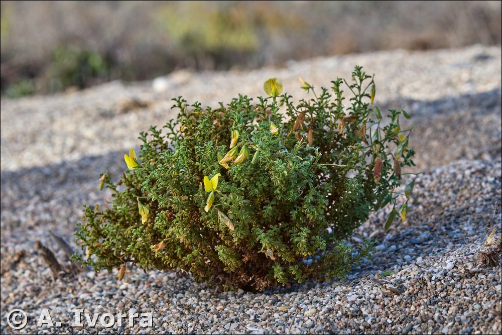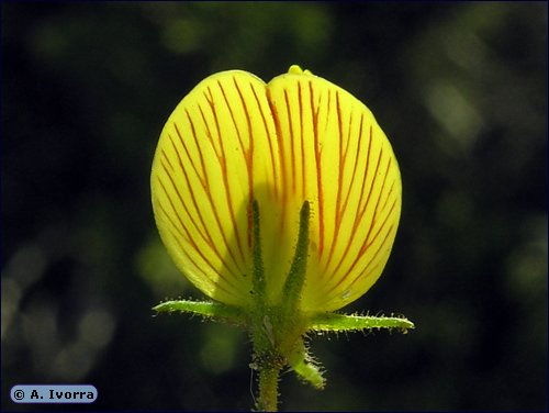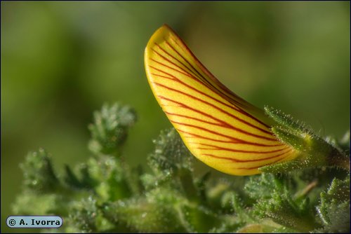 glabro, amarillo, con venas purpúreas alas y quilla amarillas o amarillo pálido. Androceo monadelfo, con todos los filamentos estaminales soldados en la mitad inferior. Ovario unicarpelar, unilocular. Fruto de 9 a 12 mm, exerto, subcilíndrico, pubérulo-glanduloso. Semillas lisas, pardas.