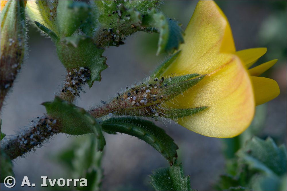 cáliz), con estandarte pubescente y nervios pardos. Androceo monadelfo, con