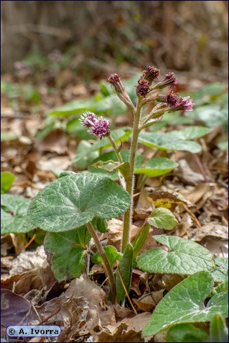 Planta herbácea, vivaz, de 10-30 cm de altura. Hojas basales aproximadas en roseta, largamente pecioladas (peciolo peloso, de 6-10 cm), reniforme-cordadas, hasta de 15 cm, glabrescentes en el haz y pelosas por el envés, con el margen regularmente dentado. De 2 a 7 hojas caulinares, reducidas, de 3-7 cm, envainantes. Inflorescencia compuesta, en racimo de cabezuelas (por lo común, con 6-10 capítulos). Brácteas involucrales linear-lanceoladas. Flores blanco