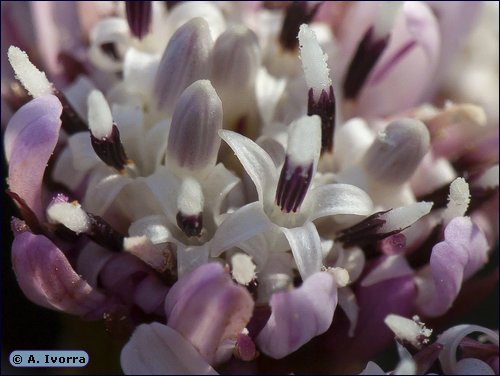 rosadas, que exhalan un cierto olor a vainilla. Lígulas de unos 5 mm.