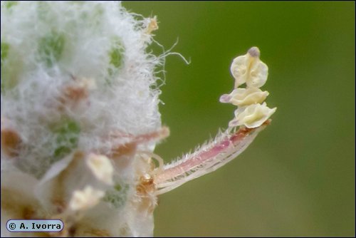 lanuginosos apical. Corola con 4 pétalos, escariosa, con tubo y lóbulos