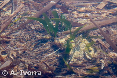 Hierba hasta de 70 cm, enraizada en el fondo marino, perenne, glabra rizoma horizontal, muy ramificado, fibroso, con escamas paleáceas y vainas de hojas muertas (las fibras de las bases foliares, con la acción del oleaje, forman bolas de 2 a 8 cm de diámetro, que se acumulan en las playas junto con otros restos de la planta). Hojas hasta de 70 cm, alternas, dísticas, envainadoras, acintadas, paralelinervias, de ápice redondeado o emarginado. Inflorescencia