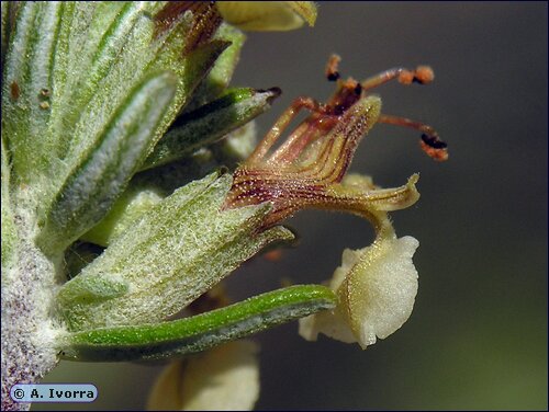 Cáliz tubular-campanulado, estrecho, verde, irregular; dientes superiores ovados, cuculados; los inferiores mucronados, con pelos patentes largos. Corola unilabiada, blanca, crema o rosada; lóbulos latero-posteriores oblongo-lanceolados, lobulados; lóbulos laterales oblongo-lanceolados, lobulados, verticales; lóbulo central lobulado, suberecto. Núculas subglobosas, reticuladas, negras o marrones.