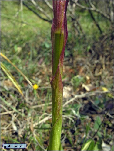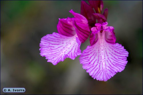 Herbácea, perenne, con dos tubérculos ovoideos. Tallos erectos, de 20-40 cm, rodeados en la base por vainas foliares. Hojas lanceoladas o linear-lanceoladas, en roseta basal. Inflorescencia con 4-10 flores purpúreas, con brácteas rojizas, lanceoladas, de 3-5 cm, plurinervadas. Perianto de tépalos libres, convergentes en una gálea. Labelo de unos 25 mm, entero, muy característico, flabeliforme (en forma de abanico), con estrías venosas radiales y borde dentado-festoneado. Espolón basal descendente, cilíndrico, con menor longitud que el ovario. Cápsula fisuricida, polisperma.
