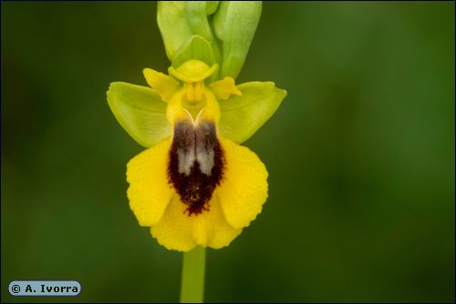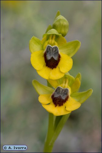 Planta herbácea de 10-30 cm de altura, con tubérculos ovoides y hojas basales ovadas, agudas. Tépalos externos glabros, verdosos, con el central incurvado, protegiendo al ginostemo. Labelo de unos 14-18 mm, trilobulado, viloso, con un margen glabro y amarillo, y cuya parte central, de color pardo-rojizo, presenta un espéculo bilobado, grisáceo. Ginostemo sin apículo. Fruto capsular.